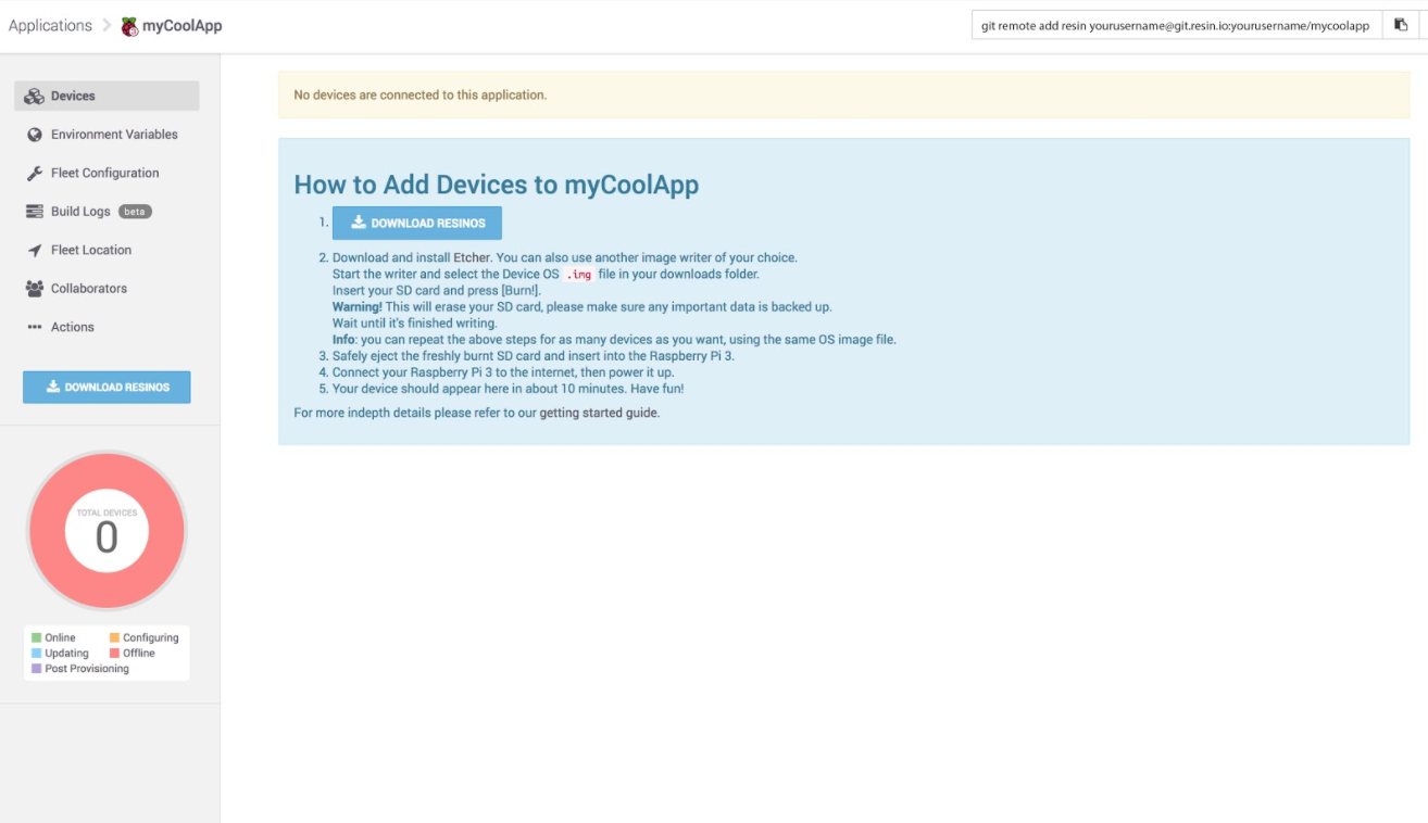Download the resinOS. Which will give you the Device OS specific for your device. When we created the application Resin.io gave us a remote url to point to the resin server. The url looks likes:
