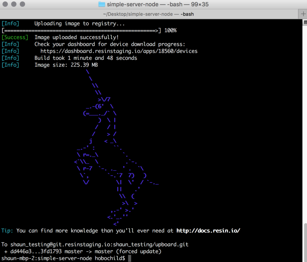 Now you are ready to push your code to Resin.io and ultimately to your devices. Commit your code and then in the terminal run: